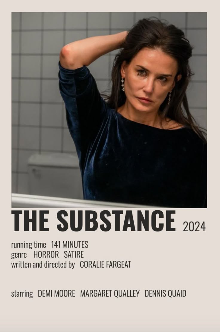 한때 인기 있던 에어로빅 스타 엘리자베스 스파클Elisabeth Sparkle(데미 무어Demi Moore)이 50세 생일에 제작자에게 퇴출당한다. 그녀는 '더 서브스턴스(The Substance)'라는 정체불명의 약물로 젊은 자신인 수Sue(마가렛 퀄리Margaret Qualley)를 만들어낸다. 주기적으로 두 자아가 교대로 살아가며, 한 명이 활동할 때 다른 한 명은 그늘에 숨는 방식이다. 하지만 수는 점점 더 오래 머물고 싶어 하고, 엘리자베스를 점점 더 소외시킨다. 결국 둘의 정체성 충돌은 극단적인 결과로 치닫는다. 영화는 젊음과 외모에 대한 집착이 어떻게 자아 파괴로 이어질 수 있는지를 극한의 신체 공포와 함께 표현한다. 결말은 매우 혼란스럽고 강렬하며, 피, 변형된 신체, 기괴한 이미지가 뒤섞인 ‘곤조’ 스타일로 엘리자베스의 내면 붕괴를 시각적으로 폭발적으로 그려낸다. 엘리자베스는 점차 수에게 완전히 밀려나며, 결국 둘의 경계는 모호해진다. “There is no she, no you. You are one: 이제 너도 나도 없다, 너는 하나일 뿐이다”라는 대사는 자아 소멸을 상징하며 작품의 절정이자 충격적인 마무리를 장식한다.